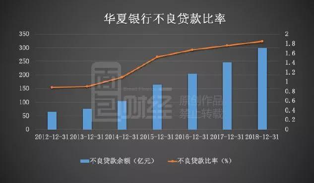 财报数据显示,过去几年,华夏银行的不良贷款余额和不良率持续上升。截至2018年底,公司的不良贷款余额为298.09 亿元,较上年末增加52.12 亿元;不良贷款率为1.85%,较上年末上升0.09 个百分点。