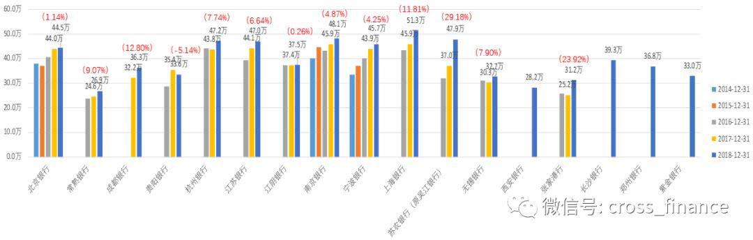 数据完整的十三家城商行中,以宁波银行的增员幅度最大,同比增长12.30%,江阴银行与南京银行较去年同期也分别增长了7.88%和8.68%。整体情况与股份制银行相似,仅有上海银行与成都银行两家员工数量小幅收窄,较去年同期分别减少1.83%和0.67%。仅从数据而言,并没有出现所谓的银行业“裁员潮”。