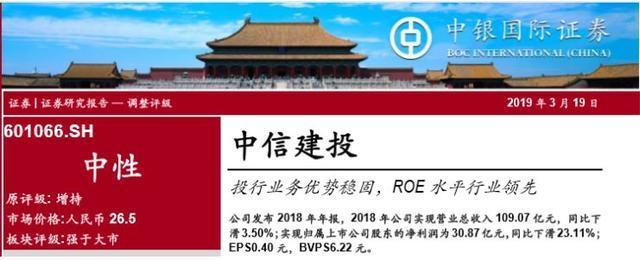 中银国际证券 将中信建投19、20年归母净利润预测值由31/37亿元上调至42/52 亿元,2021年预测净利润59亿元,但前期涨幅过大, 下调中信建投至中性评级。